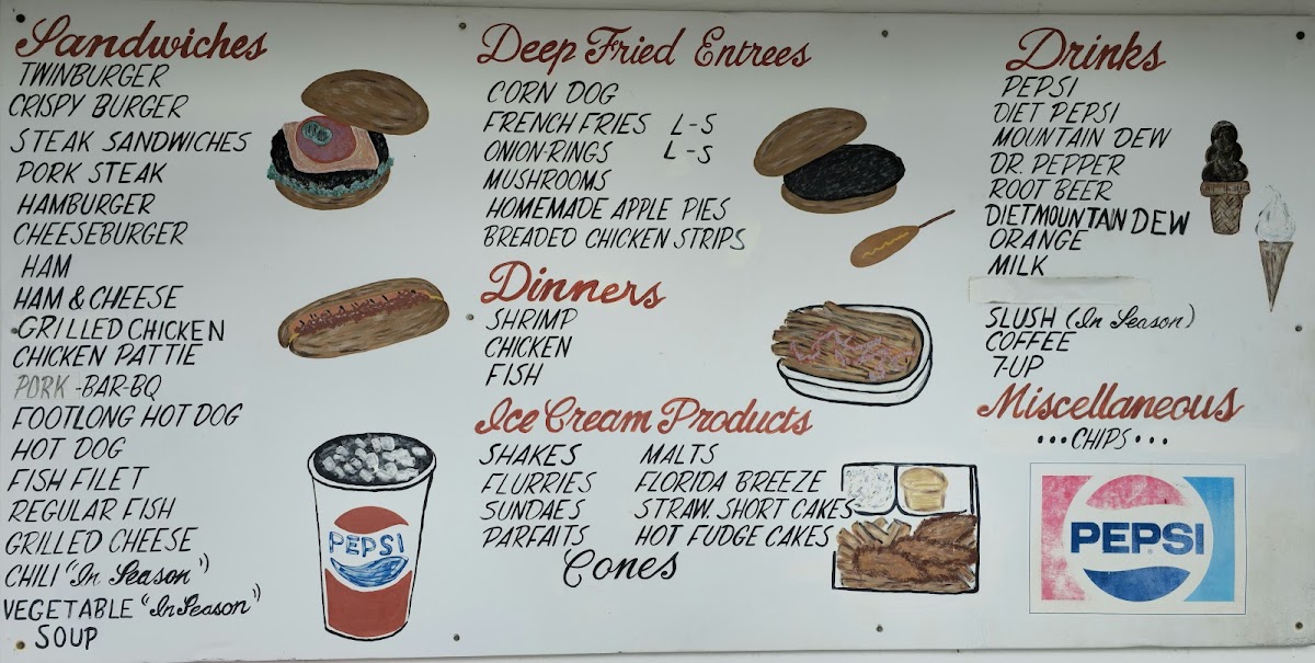 Overall, the menu caters to those looking for fast food classics alongside a range of ice cream and frozen yogurt treats, suitable for a snack, light meal, or dessert option.