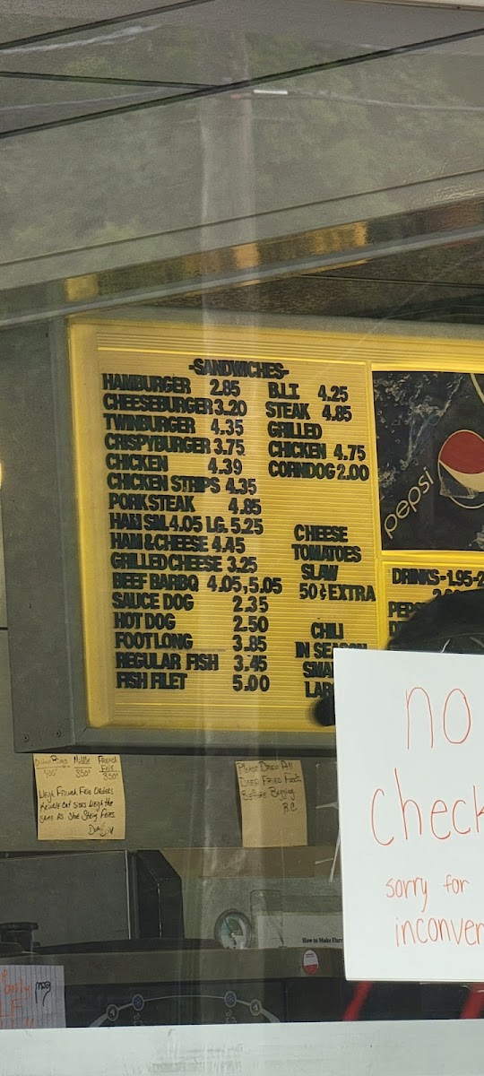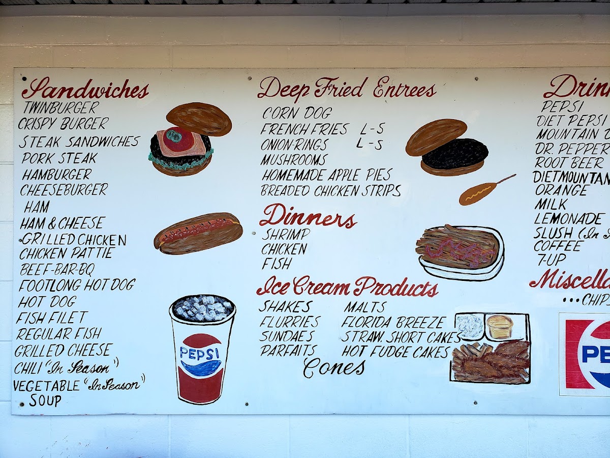 Main Items include traditional fast food selections such as hot dogs, footlong hot dogs served with different toppings and side options like fries, tots, and onion rings. There are also burger choices including double cheeseburgers and twinburgers. Combos with soda and milkshakes are available as well.